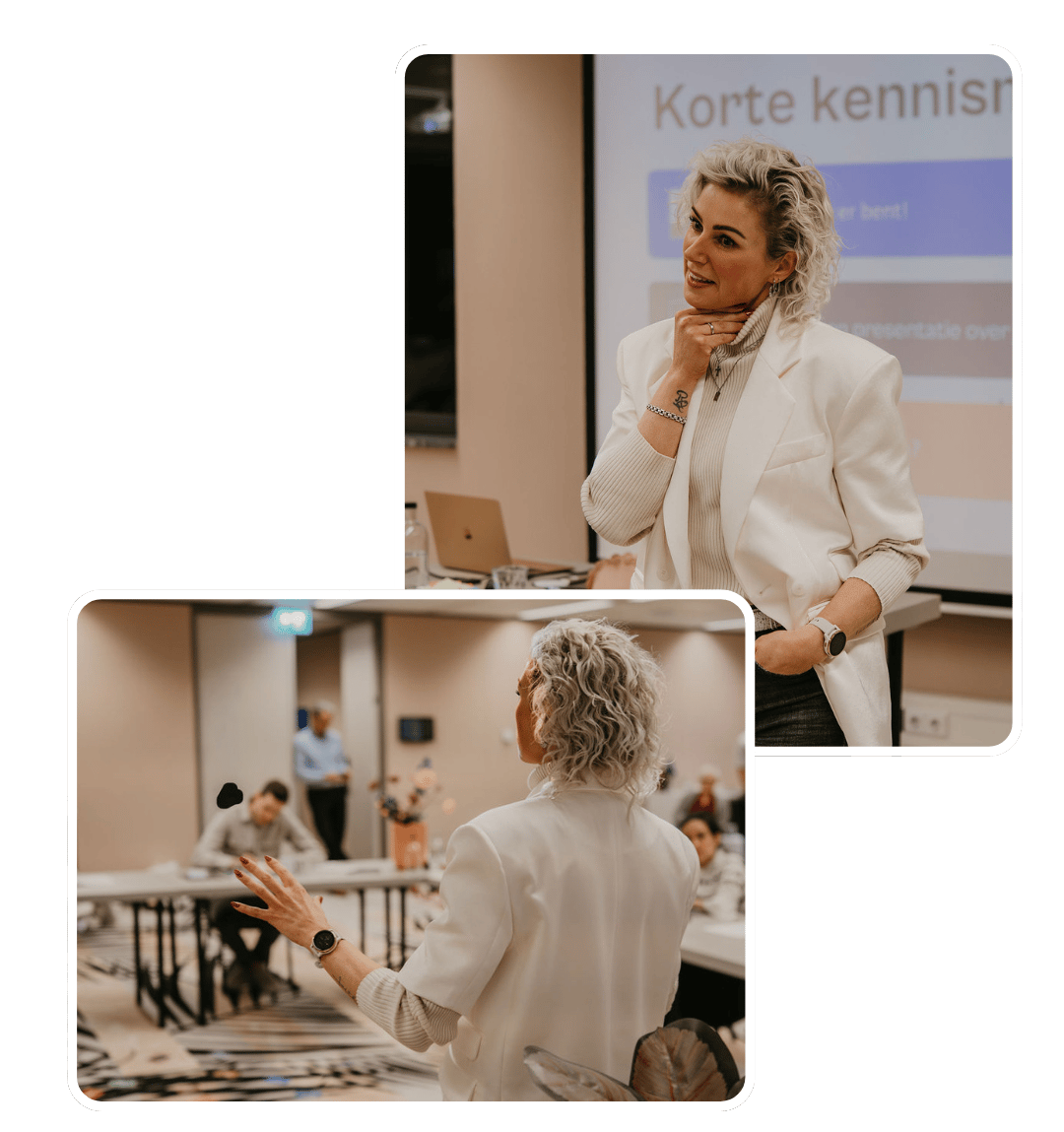 Je hebt een e-learning en live trainingsdag, en ook na afloop een 1-op-1 coachgesprek met jouw trainer of coach. Zodat jij jouw situatie nog kunt bespreken.